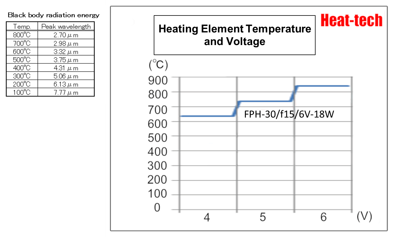 By adjusting the temperature of the heating element, the peak frequency of far-infrared radiation can be controlled.