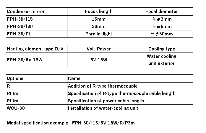 FPH-30 combines a reflecting mirror and a base-mounted heating element, and is used with a specified power cable length.