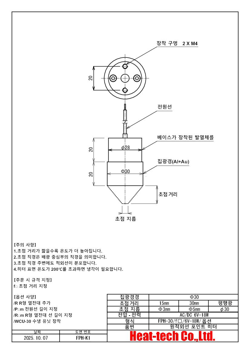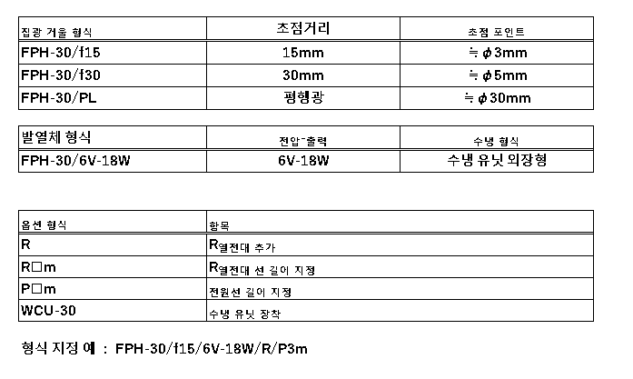 FPH-30은 집광경과 베이스가 장착된 발열체를 조합하여, 전원선 길이를 지정하여 사용합니다.