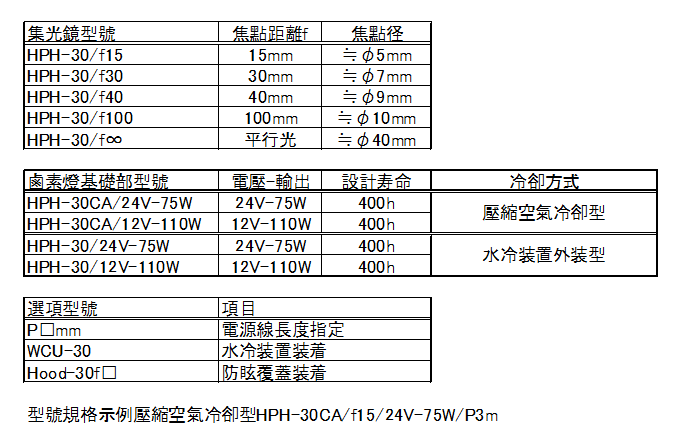 HPH-30將集光鏡和鹵素燈基部組合在一起,指定電源線的長度並使用它。